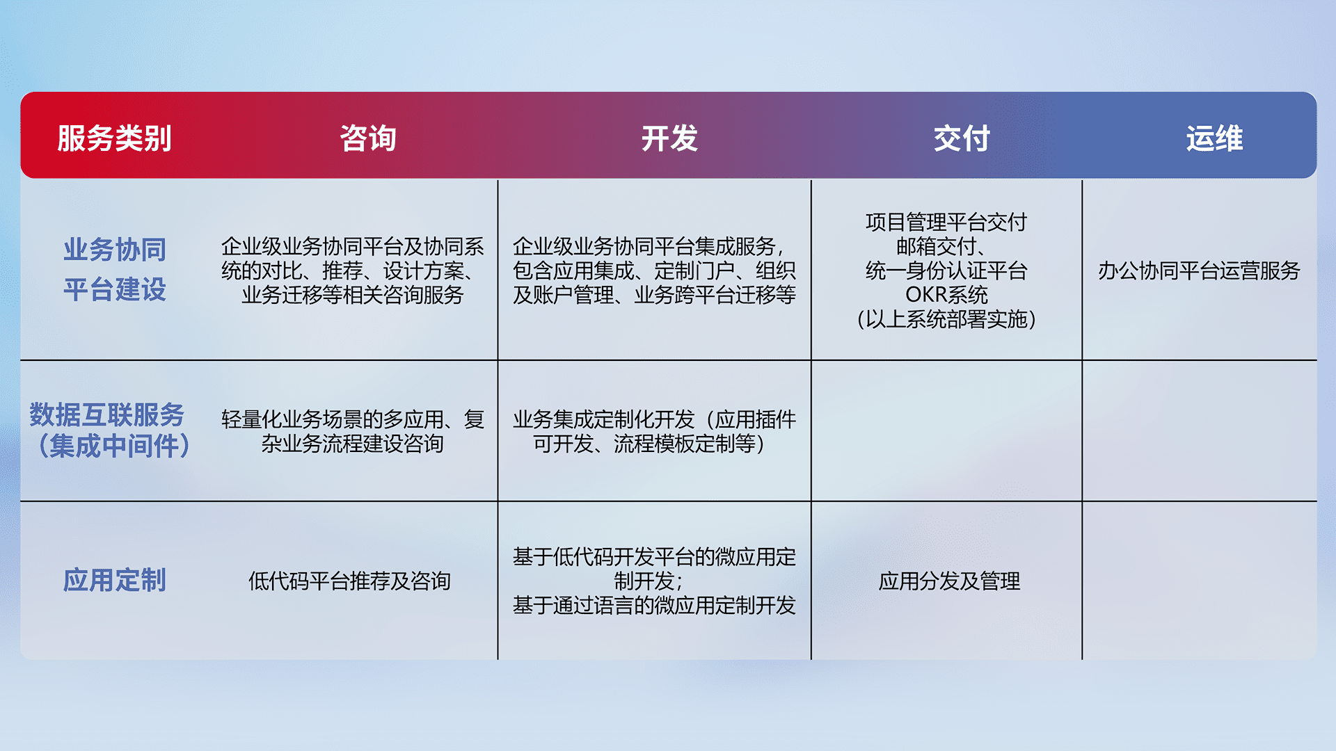 针对钉钉、、、企微、、、、IDaas等平台级产品提供产品的规划、、方案、、、交付、、、、定制化开发等服务,,实现如统一协同办公、、智能客户服务、、、、混合会议管理、、、、智能数据查询、、等业务场景,,实现数字化转型。。