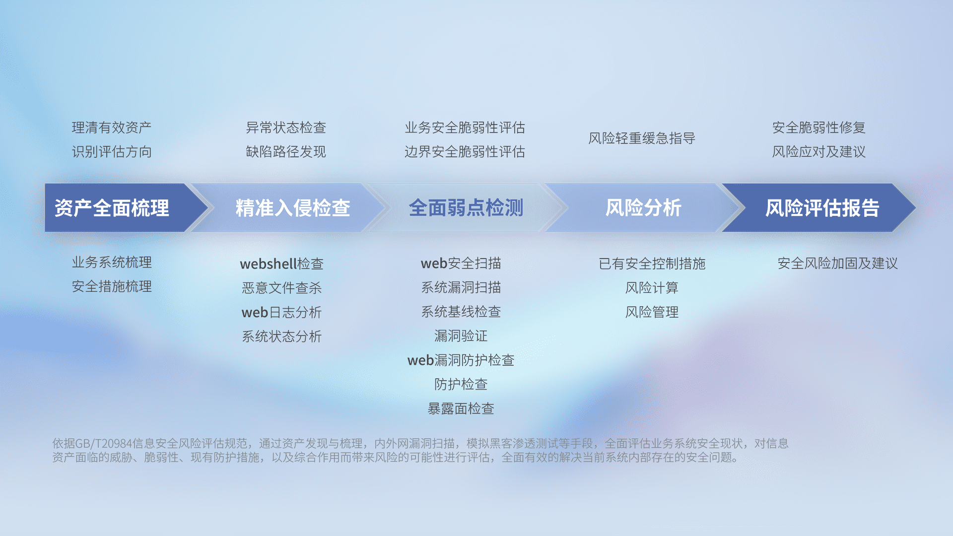 针对客户行业特性,,,,以专业的安全服务+多厂商联合解决方案提供专属的一站式安全管理服务,,帮助客户全面感知网络空间威胁,,基于识别、、检测、、、分析、、、防护、、、、监测、、响应的服务理论模型,,,从方案咨询、、、、集成交付、、评估验证、、、、优化加固、、、、运维运营,,,,致力于为客户提供完整的闭环管理式安全服务。。以实战经验为客户打造高抵御风险的安全体系,,,帮助客户发现威胁、、、对抗威胁、、处置威胁,,不断积累安全对抗能力,,持续保障数字化安全。。。